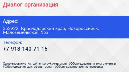 Диалог, организация по адресу 353922, Краснодарский край, Новороссийск, Малоземельская, 15а в дальнейшем Организация, размещена в следующих категориях: