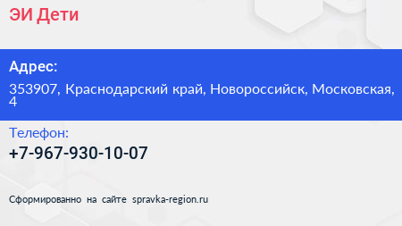 ЭИ Дети по адресу 353907, Краснодарский край, Новороссийск, Московская, 4 в дальнейшем Организация, размещена в следующих категориях: