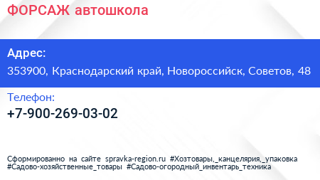 ФОРСАЖ, автошкола по адресу 353900, Краснодарский край, Новороссийск, Советов, 48 в дальнейшем Организация, размещена в следующих категориях: