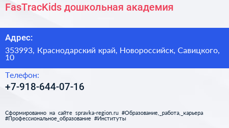 FasTracKids, дошкольная академия по адресу 353993, Краснодарский край, Новороссийск, Савицкого, 10 в дальнейшем Организация, размещена в следующих категориях:
