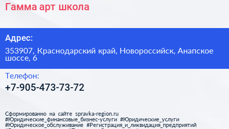 Гамма, арт-школа по адресу 353907, Краснодарский край, Новороссийск, Анапское шоссе, 6 в дальнейшем Организация, размещена в следующих категориях: