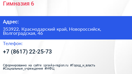Гимназия №6 по адресу 353922, Краснодарский край, Новороссийск, Волгоградская, 46 в дальнейшем Организация, размещена в следующих категориях: