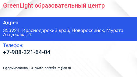 GreenLight, образовательный центр по адресу 353924, Краснодарский край, Новороссийск, Мурата Ахеджака, 4 в дальнейшем Организация, размещена в следующих категориях: