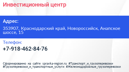 Инвестиционный центр по адресу 353907, Краснодарский край, Новороссийск, Анапское шоссе, 15 в дальнейшем Организация, размещена в следующих категориях: