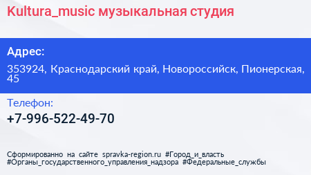 Kultura_music, музыкальная студия по адресу 353924, Краснодарский край, Новороссийск, Пионерская, 45 в дальнейшем Организация, размещена в следующих категориях: