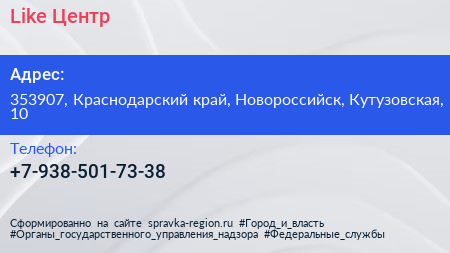 Like Центр по адресу 353907, Краснодарский край, Новороссийск, Кутузовская, 10 в дальнейшем Организация, размещена в следующих категориях: