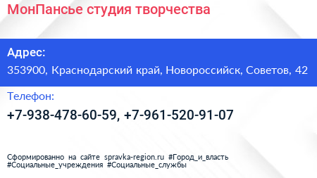 МонПансье, студия творчества по адресу 353900, Краснодарский край, Новороссийск, Советов, 42 в дальнейшем Организация, размещена в следующих категориях: