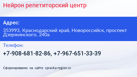 Нейрон, репетиторский центр по адресу 353993, Краснодарский край, Новороссийск, проспект Дзержинского, 240а в дальнейшем Организация, размещена в следующих категориях: