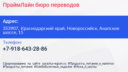 ПраймЛайн, бюро переводов по адресу 353907, Краснодарский край, Новороссийск, Анапское шоссе, 15 в дальнейшем Организация, размещена в следующих категориях:
