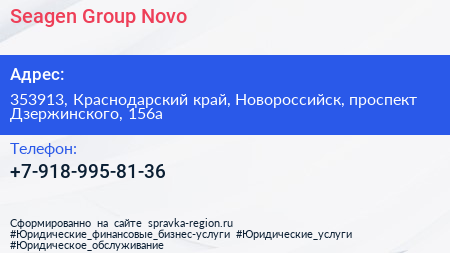 Seagen Group Novo по адресу 353913, Краснодарский край, Новороссийск, проспект Дзержинского, 156а в дальнейшем Организация, размещена в следующих категориях: