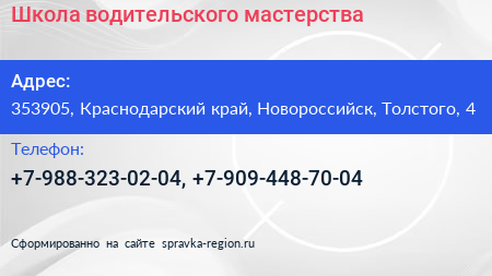 Школа водительского мастерства по адресу 353905, Краснодарский край, Новороссийск, Толстого, 4 в дальнейшем Организация, размещена в следующих категориях: