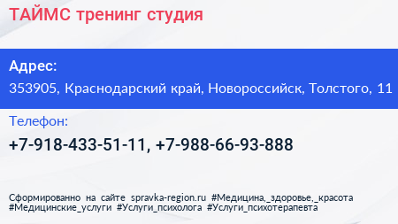 ТАЙМС, тренинг-студия по адресу 353905, Краснодарский край, Новороссийск, Толстого, 11 в дальнейшем Организация, размещена в следующих категориях: