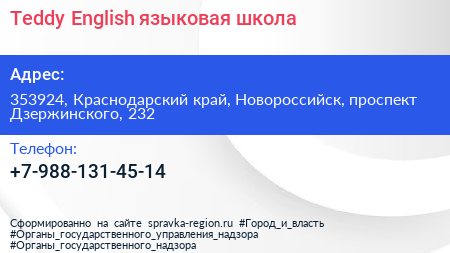 Teddy English, языковая школа по адресу 353924, Краснодарский край, Новороссийск, проспект Дзержинского, 232 в дальнейшем Организация, размещена в следующих категориях:
