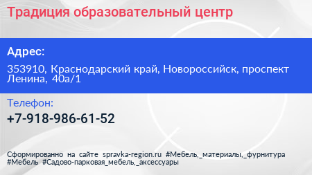 Традиция, образовательный центр по адресу 353910, Краснодарский край, Новороссийск, проспект Ленина, 40а/1 в дальнейшем Организация, размещена в следующих категориях: