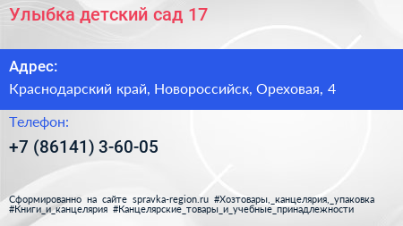 Улыбка, детский сад №17 по адресу Краснодарский край, Новороссийск, Ореховая, 4 в дальнейшем Организация, размещена в следующих категориях: