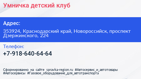 Умничка, детский клуб по адресу 353924, Краснодарский край, Новороссийск, проспект Дзержинского, 224 в дальнейшем Организация, размещена в следующих категориях: