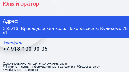 Юный оратор по адресу 353913, Краснодарский край, Новороссийск, Куникова, 28 к1 в дальнейшем Организация, размещена в следующих категориях:
