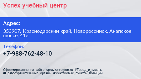 Успех, учебный центр по адресу 353907, Краснодарский край, Новороссийск, Анапское шоссе, 41е в дальнейшем Организация, размещена в следующих категориях: