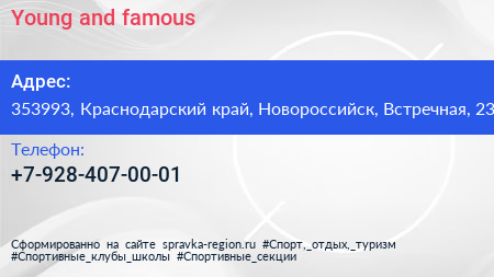 Young and famous по адресу 353993, Краснодарский край, Новороссийск, Встречная, 23 в дальнейшем Организация, размещена в следующих категориях: