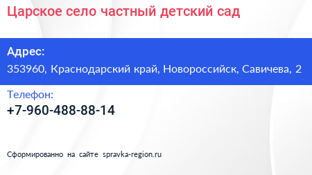 Царское село, частный детский сад по адресу 353960, Краснодарский край, Новороссийск, Савичева, 2 в дальнейшем Организация, размещена в следующих категориях: