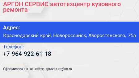 АРГОН СЕРВИС, автотехцентр кузовного ремонта по адресу Краснодарский край, Новороссийск, Хворостянского, 75а в дальнейшем Организация, размещена в следующих категориях: