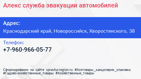 Алекс, служба эвакуации автомобилей по адресу Краснодарский край, Новороссийск, Хворостянского, 38 в дальнейшем Организация, размещена в следующих категориях: