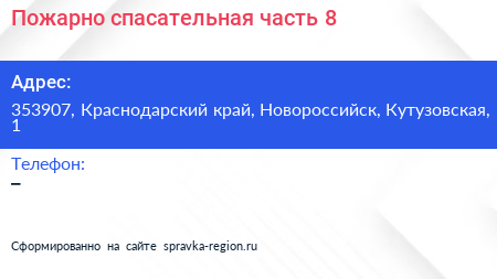 Пожарно-спасательная часть №8 по адресу 353907, Краснодарский край, Новороссийск, Кутузовская, 1 в дальнейшем Организация, размещена в следующих категориях:
