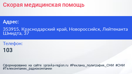 Скорая медицинская помощь по адресу 353915, Краснодарский край, Новороссийск, Лейтенанта Шмидта, 37 в дальнейшем Организация, размещена в следующих категориях: