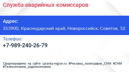 Служба аварийных комиссаров по адресу 353900, Краснодарский край, Новороссийск, Советов, 52 в дальнейшем Организация, размещена в следующих категориях: