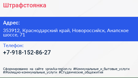 Штрафстоянка по адресу 353912, Краснодарский край, Новороссийск, Анапское шоссе, 71 в дальнейшем Организация, размещена в следующих категориях: