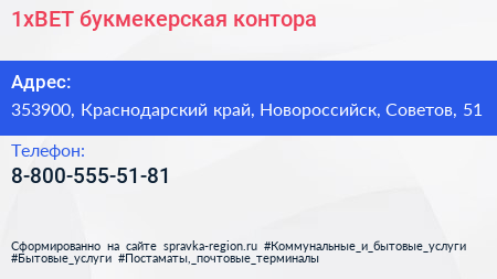 1хBET, букмекерская контора по адресу 353900, Краснодарский край, Новороссийск, Советов, 51 в дальнейшем Организация, размещена в следующих категориях: