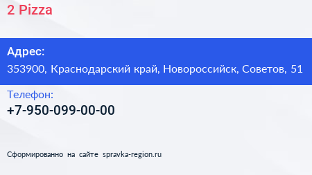 2 Pizza по адресу 353900, Краснодарский край, Новороссийск, Советов, 51 в дальнейшем Организация, размещена в следующих категориях: