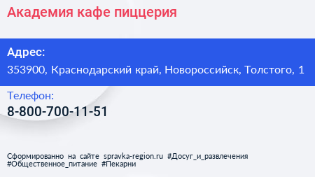 Академия, кафе-пиццерия по адресу 353900, Краснодарский край, Новороссийск, Толстого, 1 в дальнейшем Организация, размещена в следующих категориях: