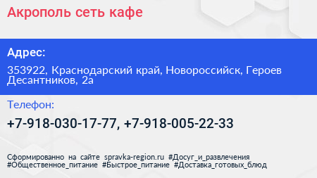 Акрополь, сеть кафе по адресу 353922, Краснодарский край, Новороссийск, Героев Десантников, 2а в дальнейшем Организация, размещена в следующих категориях: