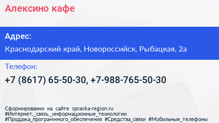 Алексино, кафе по адресу Краснодарский край, Новороссийск, Рыбацкая, 2а в дальнейшем Организация, размещена в следующих категориях: