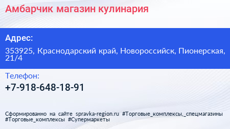 Амбарчик, магазин-кулинария по адресу 353925, Краснодарский край, Новороссийск, Пионерская, 21/4 в дальнейшем Организация, размещена в следующих категориях: