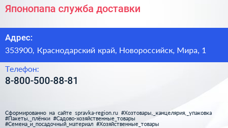 Японопапа, служба доставки по адресу 353900, Краснодарский край, Новороссийск, Мира, 1 в дальнейшем Организация, размещена в следующих категориях: