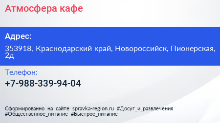Атмосфера, кафе по адресу 353918, Краснодарский край, Новороссийск, Пионерская, 2д в дальнейшем Организация, размещена в следующих категориях: