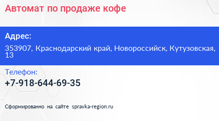 Автомат по продаже кофе по адресу 353907, Краснодарский край, Новороссийск, Кутузовская, 13 в дальнейшем Организация, размещена в следующих категориях: