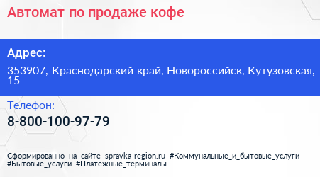 Автомат по продаже кофе по адресу 353907, Краснодарский край, Новороссийск, Кутузовская, 15 в дальнейшем Организация, размещена в следующих категориях: