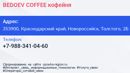 BEDOEV COFFEE, кофейня по адресу 353900, Краснодарский край, Новороссийск, Толстого, 2Б в дальнейшем Организация, размещена в следующих категориях: