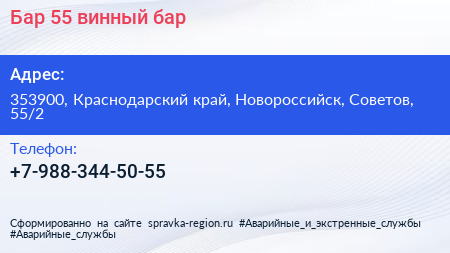 Бар 55, винный бар по адресу 353900, Краснодарский край, Новороссийск, Советов, 55/2 в дальнейшем Организация, размещена в следующих категориях: