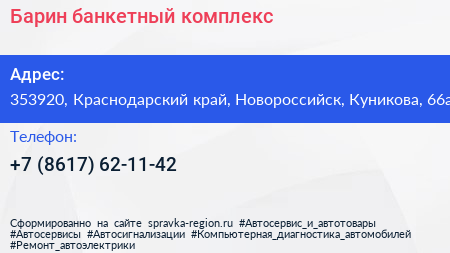 Барин, банкетный комплекс по адресу 353920, Краснодарский край, Новороссийск, Куникова, 66а в дальнейшем Организация, размещена в следующих категориях: