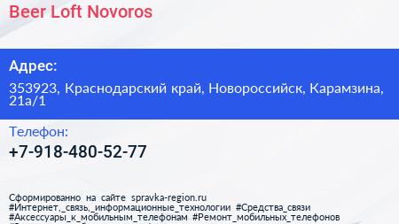 Beer Loft Novoros по адресу 353923, Краснодарский край, Новороссийск, Карамзина, 21а/1 в дальнейшем Организация, размещена в следующих категориях: