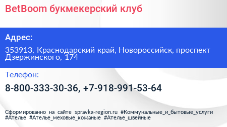 BetBoom, букмекерский клуб по адресу 353913, Краснодарский край, Новороссийск, проспект Дзержинского, 174 в дальнейшем Организация, размещена в следующих категориях: