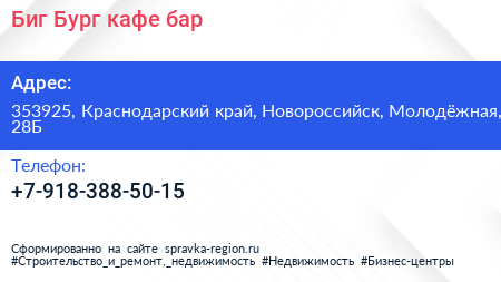 Биг Бург, кафе-бар по адресу 353925, Краснодарский край, Новороссийск, Молодёжная, 28Б в дальнейшем Организация, размещена в следующих категориях: