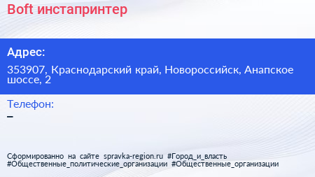 Boft, инстапринтер по адресу 353907, Краснодарский край, Новороссийск, Анапское шоссе, 2 в дальнейшем Организация, размещена в следующих категориях: