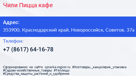 Чили Пицца, кафе по адресу 353900, Краснодарский край, Новороссийск, Советов, 37а в дальнейшем Организация, размещена в следующих категориях: