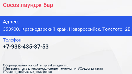 Cocos, лаундж-бар по адресу 353900, Краснодарский край, Новороссийск, Толстого, 2Б в дальнейшем Организация, размещена в следующих категориях: