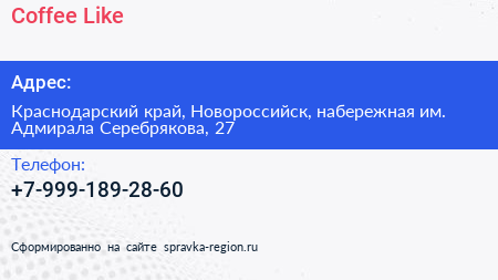 Coffee Like по адресу Краснодарский край, Новороссийск, набережная им. Адмирала Серебрякова, 27 в дальнейшем Организация, размещена в следующих категориях: